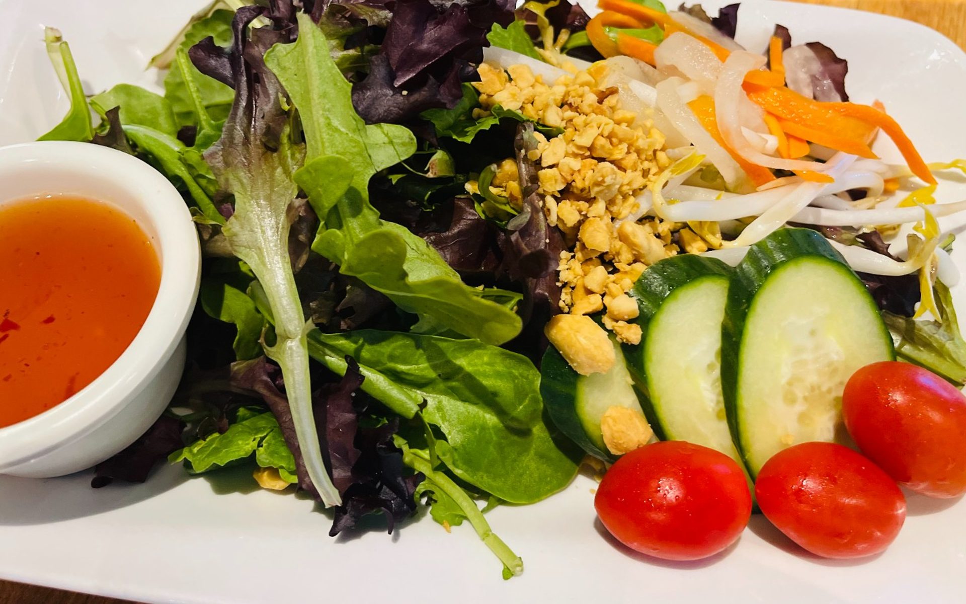 A hole in the wall Thai restaurant in a very very busy strip mall! Their Pad Thai was SO GOOD. It was so savory, so full of flavor. I love the slight spicy flavor it had in it. The wine was delicious too. Best part of the meal was the unexpected pineapple dessert that apparently comes with every dine in meal! Sliced pineapple with some flavored powdered sugar. I've never had anything like it! Servers were very friendly too!